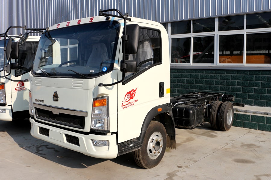 采用重汽豪沃底盤,單排駕駛室可前翻,朝柴143馬力發(fā)動機(jī),6檔變速箱,軸距3360mm,2噸前橋,5噸后橋,7.50R16鋼絲胎,原廠abs,帶方向助力,離合助力器,氣剎制動。